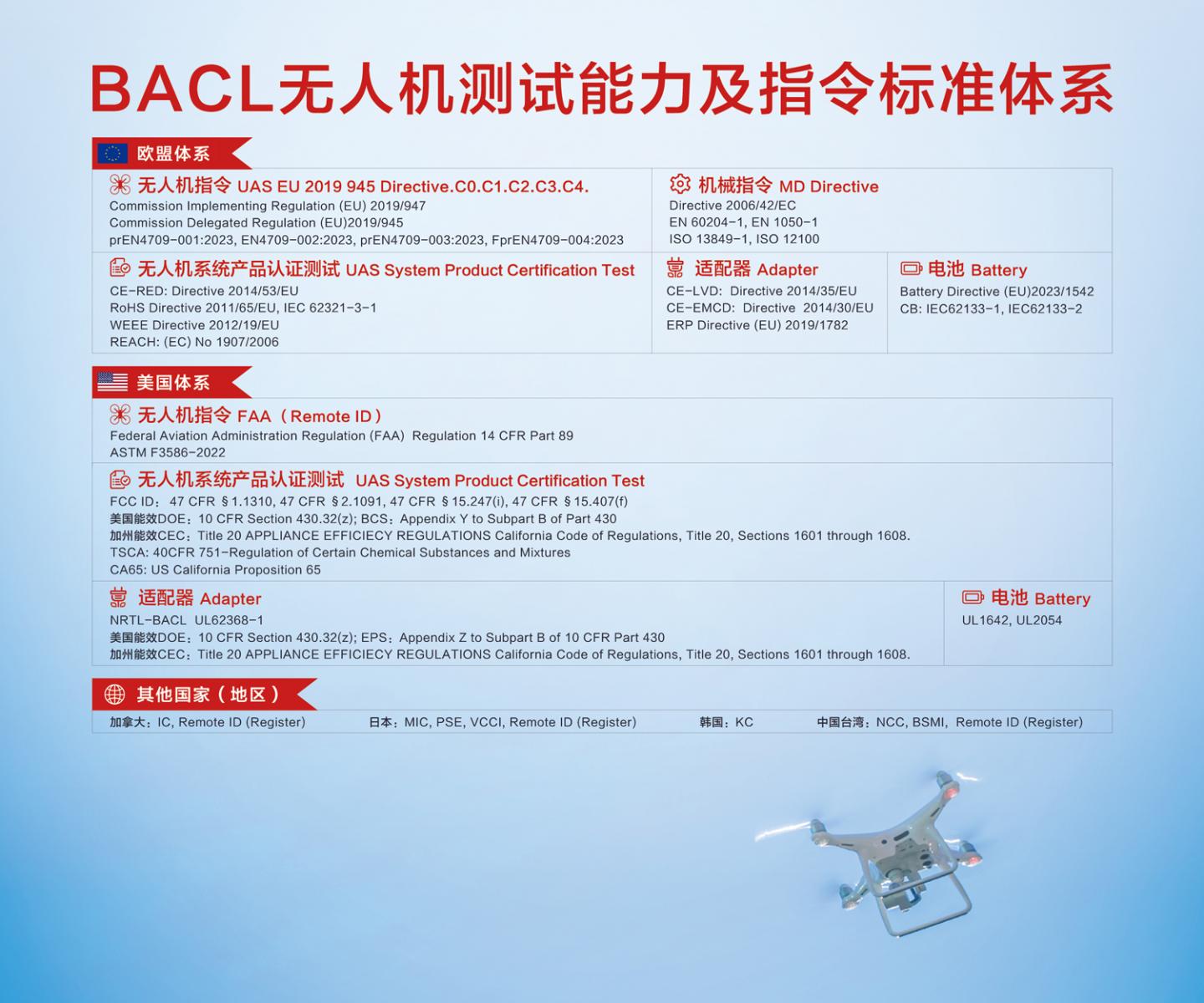 在無(wú)人機檢測領(lǐng)域,BACL是國內唯一獲得全套ISO17025認證的第三方機構。我們在東莞設有飛行測試場(chǎng)地,配備博士測試團隊及資深專(zhuān)業(yè)飛手,能夠一站式完成無(wú)人機光學(xué)、EMC/RF、軟件及場(chǎng)外飛行等全套測試項目。此外,我們服務(wù)高效,可確保您在4-6周獲得歐洲發(fā)證。通過(guò)BACL檢測認證,您的產(chǎn)品將確保符合CE法規(EU 2019/945,EU 2019/947)等國際標準,順利進(jìn)入目標市場(chǎng)。