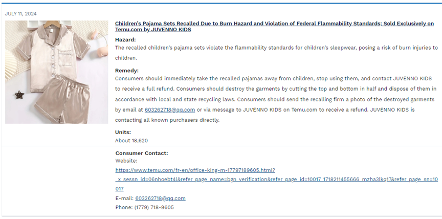 僅在2024年7月11日一天美國就有3起因為兒童睡衣因燃燒不合格而召回的案例。